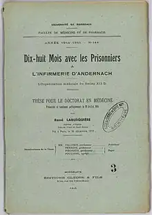 En , les plus âgés des élèves de la promotion 1939 sont désignés pour assurer la relève des médecins civils faits prisonniers en 1940. Labusquière est affecté comme médecin-chef de l'infirmerie d'Andernach en Rhénanie-Palatinat (matricule 18 678)[1]. Il est libéré le et rejoint Bordeaux. Le , il soutient sa thèse dans laquelle il expose son expérience et l'organisation sanitaire du Stalag XII D[6]. Dans celle-ci il défend le principe de la relève, estimant que ce fut son honneur de ne pas se soustraire à cette mission contrairement à ceux de ses camarades qui ont réussi à s’échapper ; opinion qui n’eut pas le loisir de plaire aux médecins de la France libre[7].