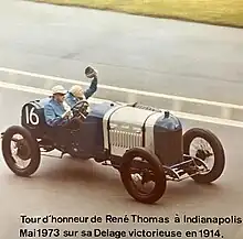 René Thomas remporte les 500 miles d'Indianapolis 1914 au volant d'une Delage semi-officielle. En effet, Louis Delage, ne cautionnant pas la participation de sa marque à l'épreuve américaine, avait exigé que René Thomas et son coéquipier Albert Guyot se portent acquéreurs de leurs montures. Il double à deux reprises après le 200e kilomètre ses concurrents français les plus sérieux (Goux et Boillot), malgré l'obligation de changer un pneu éclaté en évitant de peu la sortie de piste, puis va s'imposer avec en fin de course la fixation cassée du collier de fixation de son tuyau d'échappement, obligeant son mécanicien embarqué (Robert Laly) à maintenir ce dernier sous son bras avec les risques de brûlures que l'on imagine[10]. Les quatre premiers pilotes sont francophones et leurs voitures, de marque française (deux Delage intercalées avec deux Peugeot) ; ils représentent six des quinze premiers classés. Barney Oldfield cinquième étant le premier pilote arrivé sur un véhicule américain. Cette victoire permet à Thomas de terminer troisième du championnat des États-Unis (AAA National Championship Trail)[11].