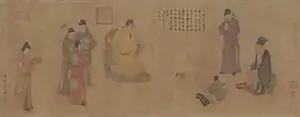 - Une version de cette peinture: Zhang Guo, célèbre magicien taoïste, fait apparaître un cheval de petite taille, plein de feu. Le regard fixe du souverain fasciné est en contraste saisissant avec celui du magicien, regard aigu qui transmet l'énergie. La peinture est remarquable par l'éclat des couleurs. Elle l'est aussi par la beauté du dessin linéaire, sans doute hérité de la tradition de Li Longmian