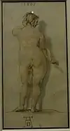 ![]() | 58 | Une grosse femme nue, de dos[LLB 68] | atelier d'Albrecht Dürer | 1505 | plume et encre brune, lavis d'aquarelle et rehauts de gouache blanche | H. 22,5 cm ; l. 11,5 cm | INV 18609 recto | département des Arts graphiques, ancienne collection Charles-Paul de Saint-Morys, saisie des biens des Émigrés en 1793, remise au muséum en 1796-1797 | |