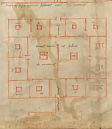 Le plan de Saint-Gall est une source d'information précieuse, qui présente en particulier le plan d'une école. À partir du flanc de l'église[87], on accède à un bâtiment situé entre la maison de l'abbé et la résidence pour les invités nobles. Douze cellules, sans doute les chambres des écoliers (mansiunculae scolasticorum hic) entourent deux grandes pièces communes (domus communis scolae) où se déroulent les cours. Un coin semble réservé à la récréation (id (est) vacationis)[réf. nécessaire][88]. Un couloir mène aux latrines (necessarius exitus), qui comprennent quinze places. Le bâtiment dans son ensemble est couvert d'une toiture de tuiles ajourée pour l'aération et la lumière (testu). La maison du maître se trouve quant à elle contre l'église, face à l'entrée[89].