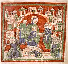 En Italie, l'atelier d'ivoire de Milan est réputé pour ses œuvres destinées aux empereurs, mais c'est surtout à Rome qu'émerge un foyer culturel majeur. La ville elle-même se transforme au cours du Xe siècle (croissance démographique, nouveaux quartiers) et la « cité léonine » attire pèlerins, lettrés et artistes. De nombreux monastères sont restaurés, notamment Saint-Paul-hors-les-murs et Saints-Boniface-et-Alexis, sur l'Aventin, deux monastères repris par les clunisiens[81]. L'église Saint-Sébastien est fondée par le médecin Pierre vers 977 et décorée de fresques : un synode y est réuni en 1001 par Otton III et Sylvestre II. Surtout, Otton III veut faire de Rome sa capitale, bien que sa mort en 1002 ne permette pas à ce rêve d'aboutir. Il fait notamment construire une église sur l'île Tibérine, où sont réutilisées des colonnes antiques, et où un puits sculpté représente l'empereur entouré d'évêques. Il fait aussi reconstruire une résidence sur le Palatin, à l'emplacement de l'ancien palais d'Auguste[82].