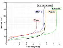 ![]() Graphique de comparaison entre l’altitude (axe y) et la vitesse (axe x) des atterrissages sur Mars |