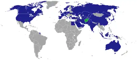 Voici les représentations diplomatiques de l'Afghanistan à l'étranger, hormis les consulats honoraires :