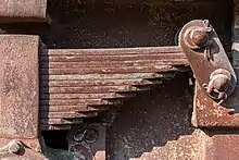 - les lames ne sont généralement pas de section rectangulaire, elles portent des nervures qui les maintiennent alignées, comme le montre la figure ci-après. Il existe d'ailleurs des profilés normalisés spécialement formés pour réaliser des ressorts à lames ;