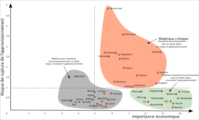 - les matériaux critiques sont ceux dont le risque d'approvisionnement est principalement dû au fait que la majeure partie de la production mondiale provient de Chine, de Russie, de la République démocratique du Congo et du Brésil. Cette concentration de la production repose, dans la plupart des cas, sur le manque de substitutabilité et du faible taux de recyclage.