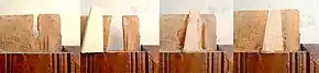 L’autre partie comporte souvent un arrachage sur les joues de la mortaise allant d’un trou de cheville à l’autre. Une traverse étant généralement bloquée par deux chevilles afin d’éviter le phénomène de pivot, d’axe.