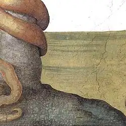 La perte de profondeur n'est pas le seul facteur vivement déploré. Un aspect important de l'œuvre de Michel-Ange, qui a disparu à jamais dans de nombreuses occurrences, est la peinture des pupilles des yeux de ses personnages[23]. Cependant, tout le monde ne s'accorde pas à dire qu'il s'agit d'ajouts à sec de Michel-Ange : il pourrait aussi s'agir d'ajouts de restaurateurs ultérieurs désireux d'amplifier la lisibilité des fresques[23].