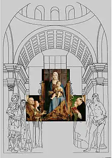 Du grand retable original Conversation sacrée, il ne reste aujourd'hui que la Vierge en majesté et quatre saints vus en buste : saint Nicolas de Bari, Marie de Magdala, sainte Ursule et saint Dominique. À l'origine il y avait quatre saints par côté parmi lesquels saint Georges et saint Sébastien.