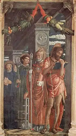 Une Vierge à l'Enfant, trône dans la partie centrale entourés d'anges musiciens, et les saints sont répartis dans les panneaux latéraux, mais dans la continuité d'un même espace perspectif. Les panneaux latéraux se raccordent exactement et ne sont séparés que par les détails architectoniques dans la tradition des polyptyques, soit des colonnes cannelées à chapiteaux sculptés, la continuité architecturale étant prolongée dans le décor peint des tableaux par Mantegna dont le talent pictural mêle toujours peinture et architecture antique. Ici la scène carrée, placée dans un jardin, est entourée d'une architrave en marbre agrémentée d'une frise de putti, supportée par des colonnes carrées, avec, au milieu, un plafond à caissons.