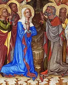 Au centre de la scène de la Pentecôte, la Vierge Marie est assise avec un livre ouvert, alors que, dans la peinture byzantine, on représentait habituellement saint Pierre et saint Paul à cette place. Les douze apôtres, sur lesquels le Saint-Esprit est descendu sous forme de langues de feu, ont été dotés du don de maîtriser les langues de toutes les nations afin de pouvoir propager l'Évangile. Le motif de l'apôtre qui porte son doigt à sa bouche comme symbole du silence serait emprunté à l'art italien, dans lequel il représente l'obéissance ou de la patience[20].
