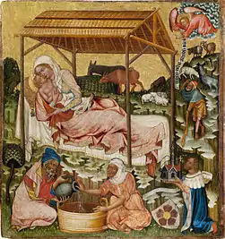Cette image est au centre de trois scènes. Ici, la scène représente Marie avec le Christ nouveau-né dans un abri simple et ouvert. Elle est accompagnée en arrière-plan des animaux apocryphes habituels. Au premier plan, Joseph prépare un bain avec la sage-femme (cette scène est décrite dans les évangiles apocryphes, où cette sage-femme est appelée Salomé) et au second plan l'archange Gabriel annonce la bonne nouvelle aux bergers (scène de l'Annonce aux bergers). L'implication visible de Joseph, en tant que père adoptif, dans la scène, notamment dans les soins du nouveau-né, est relativement inhabituelle dans la première moitié du XIVe siècle, même si des exemples existent dès le XIIIe siècle. Ce détail ne s’appuie sur aucune source textuelle et, selon toute vraisemblance, trouverait son origine dans le contexte laïc de la société bourgeoise ; cette attitude se retrouve dans des cantiques de Noël de l'époque qui, cependant, représentent le père adoptif du Christ comme une figure parfois presque grotesque. Dans toutes cette scène, on peut retrouver une multitude de petits motifs qui trouvent leur origine dans l'art byzantin réinterprété par les peintres italiens.
