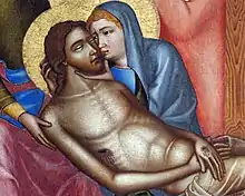 Dans les cycles de la Passion, la Crucifixion est souvent suivie de la scène de la Descente de Croix et de la Mise au Tombeau. La Déploration du Christ, qui n'est pas mentionnée dans les Évangiles, est généralement absente des représentations plus anciennes[19]. Jusqu'au XIVe siècle, la Déploration faisait partie de la scène de la Mise au Tombeau et cette scène n'apparaît séparément que dans les Meditationes Vitae Christi et dans la fresque de Giotto de la chapelle des Scrovegni.
