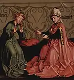 - Albert Chätelet (1987) a postulé que le retable comprenait dix panneaux recto-verso, de sorte que l'Annonciation constituait un troisième registre supérieur