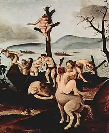 Le panneau est généralement identifié à ceux qui décoraient une pièce du Palazzo Del Pugliese à Florence, vus et décrits par Vasari. Par ses dimensions, c'était probablement un dosseret, une tête de lit (spalliera di letto). Avec La Chasse primitive, il entra au musée de New York en 1875, par un don de Robert Gordon.