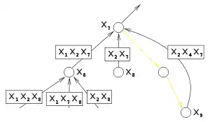 En d’autres termes, lorsque toutes les valeurs de ont été testées, l’algorithme peut faire un saut vers une variable précédente à partir du moment ou la valeur de vérité de l’évaluation partielle de des nœuds feuilles descendants de . est fausse.