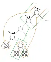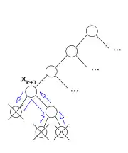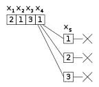 | Un exemple dans lequel l’affectation partielle courante de a été essayée sans succès pour toutes les valeurs possibles de . Le retour sur trace revient sur , en essayant de lui attribuer une nouvelle valeur. | Au lieu de retourner au niveau encore supérieur, l’algorithme élabore en démontrant qu’aucune des affectations , , et | En conséquence, l’affectation de ne conduit jamais à une solution non plus. L’algorithme revient alors directement à , en tentant de lui affecter une nouvelle valeur. |