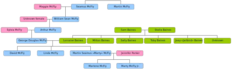 Hill Valley, le . Marty McFly, un adolescent typique des années 1980, mène l'existence d'un garçon de son âge, celle d'un lycéen fana de musique. Son père, George McFly, timide, couard et ne supportant pas le conflit, s'écrase sans cesse devant son chef de bureau Biff Tannen qui l'oblige à rédiger ses propres comptes rendus. La mère de Marty, Lorraine Baines-McFly a un penchant pour la boisson, son mariage avec George lui pesant. Très possessive et un peu vieux jeu, elle juge défavorablement la petite amie de son fils, Jennifer, qu'elle trouve trop émancipée. Marty a aussi un frère, Dave et une sœur, Linda, qui ont une vie d'Américains moyens comme le reste de la famille.