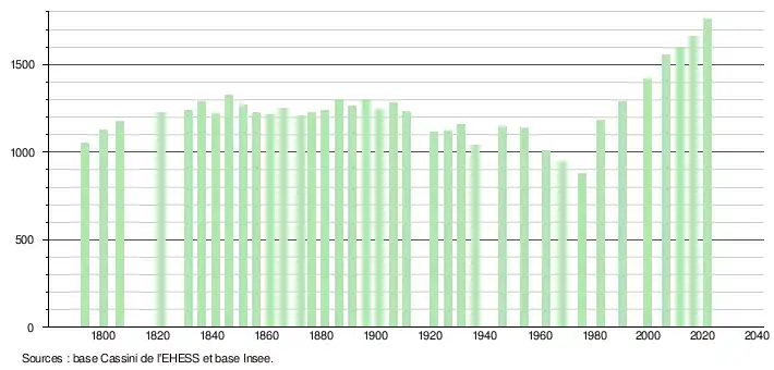 L'évolution du nombre d'habitants est connue à travers les recensements de la population effectués dans la commune depuis 1793. Pour les communes de moins de 10 000 habitants, une enquête de recensement portant sur toute la population est réalisée tous les cinq ans, les populations légales des années intermédiaires étant quant à elles estimées par interpolation ou extrapolation[25]. Pour la commune, le premier recensement exhaustif entrant dans le cadre du nouveau dispositif a été réalisé en 2006[26].