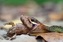 Rhabdophis chrysargos avalant un crapaud dans le parc national de Kaeng Krachan, Thaïlande