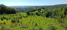 Vue depuis le tracé du limes (tour de guet romaine IX) en forêt de Rheinbrohl vers la vallée du Rhin avec l'Eifel en arrière-plan. Photo de juin 2021