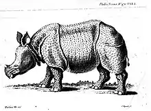 Rhinocéros indien. C'est le troisième de l'Europe moderne, un siècle après la mort du second. Ce rhinocéros, provenant dit-on de la Cour de Golconde, fut ramené par le capitaine Henry Udall à bord du Herbert, un navire de la Compagnie anglaise des Indes orientales. Il débarqua à Londres en janvier 1684 et fut aussitôt vendu pour 2000 livres à un entrepreneur privé pour être exposé à la Bartholomew Fair, ou à l’auberge de la Belle Sauvage de Ludgate Hill. Le public paye 1 shilling pour le voir, 2 shillings pour avoir le droit de le chevaucher. La Belle Sauvage encaissait jusqu'à 15 livres par jour. C'est le premier rhinocéros privatisé (et sans doute rentable) de l'histoire : depuis celui de Ptolémée II Philadelphe, en passant par tous les empereurs romains, jusqu'à celui de Philippe II d'Espagne, la possession d'un rhinocéros avait toujours été en Occident monopole royal ou impérial. Ce rhinocéros vécut à Londres près de deux ans et demi, et mourut en 1686.