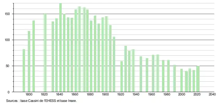 L'évolution du nombre d'habitants est connue à travers les recensements de la population effectués dans la commune depuis 1793. Pour les communes de moins de 10 000 habitants, une enquête de recensement portant sur toute la population est réalisée tous les cinq ans, les populations légales des années intermédiaires étant quant à elles estimées par interpolation ou extrapolation[15]. Pour la commune, le premier recensement exhaustif entrant dans le cadre du nouveau dispositif a été réalisé en 2005[16].
