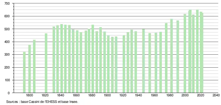 - Population municipale légale en vigueur au 1er janvier 2024, millésimée 2021, définie dans les limites territoriales en vigueur au 1er janvier 2023, date de référence statistique : 1er janvier 2021.