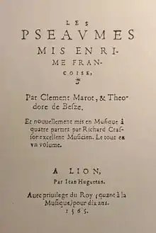 - Les Pseaumes mis en rime françoise par Clément Marot et Théodore de Besze. Et nouvellement mis en musique à quatre parties par Richard Crassot excellent musicien. Le tout en un volume. - Lyon : Thomas de Straton, 1564. - 16°, [320] + [112] f.[7]