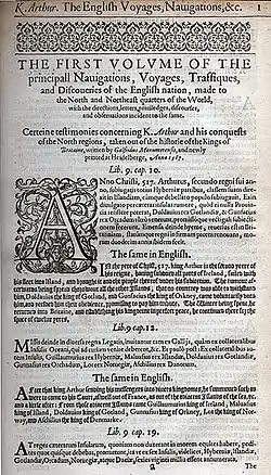 La première publication de Hakluyt, intitulée A Short and Briefe Narration (1580), était une traduction du Bref Récit et Succincte Narration de la Navigation Faite en MDXXXV et MDXXXVI[12] de l'explorateur français Jacques Cartier, récit de son second voyage au Canada en 1535–1536. Hakluyt poursuivit par un essai intitulé Divers Voyages Touching the Discoverie of America and the Ilands Adjacent unto the Same, Made First of all by our Englishmen and Afterwards by the Frenchmen and Britons (1582).