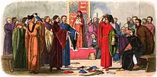 Des accusations mutuelles de trahison amènent Bolingbroke, fils aîné de Jean de Gand et cousin du roi, et Mowbray, duc de Norfolk à un duel judiciaire. Le roi Richard, qui préside cette cérémonie, l'interrompt brutalement et, après consultation de son conseil, condamne les deux adversaires à l'exil, Bolingbroke à dix années, Mowbray au bannissement à vie.