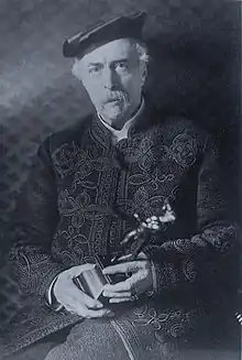 - au même âge (1888), par John Thomson (1837-1921), photographe officiel de la reine Victoria depuis 1881 le montre en veste d'intérieur en flanelle et coiffé d'un béret de fumeur en peau, au regard assez fixe voire inquiet, tenant un flagelleur en bronze de Duquesnoy[33] ; cette attitude d'amateur d'art évoque celle du peintre Jacques Jordaens - dont la nombreuse clientèle comprenait collectionneurs et marchands d'art - qui vers 1648 s'est représenté debout devant une fenêtre, tenant à deux mains une statuette de jeune femme nue à l'enfant (Angers, musée des Beaux-Arts). À noter que dans son Portrait de collectionneur reproduit supra, Scott a pris une pose similaire, assis dans un siège et devant un bureau de style Louis XV ;