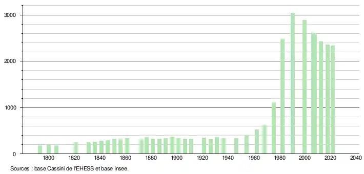 L'évolution du nombre d'habitants est connue à travers les recensements de la population effectués dans la commune depuis 1793. Pour les communes de moins de 10 000 habitants, une enquête de recensement portant sur toute la population est réalisée tous les cinq ans, les populations légales des années intermédiaires étant quant à elles estimées par interpolation ou extrapolation[22]. Pour la commune, le premier recensement exhaustif entrant dans le cadre du nouveau dispositif a été réalisé en 2007[23].