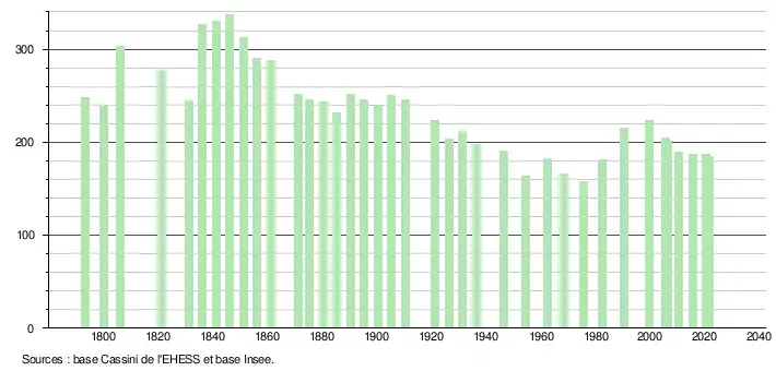 L'évolution du nombre d'habitants est connue à travers les recensements de la population effectués dans la commune depuis 1793. Pour les communes de moins de 10 000 habitants, une enquête de recensement portant sur toute la population est réalisée tous les cinq ans, les populations légales des années intermédiaires étant quant à elles estimées par interpolation ou extrapolation[16]. Pour la commune, le premier recensement exhaustif entrant dans le cadre du nouveau dispositif a été réalisé en 2005[17].