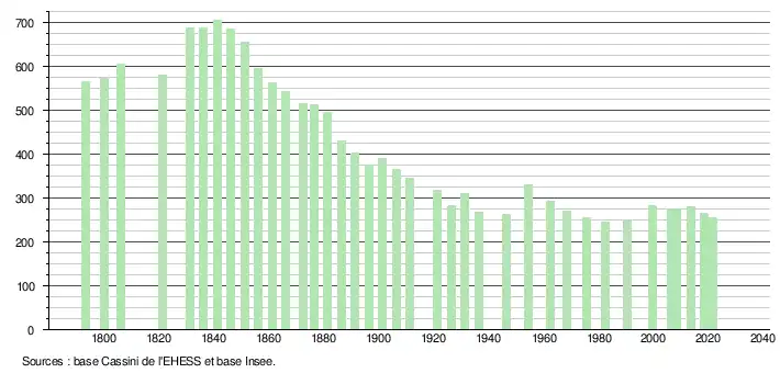 L'évolution du nombre d'habitants est connue à travers les recensements de la population effectués dans la commune depuis 1793. Pour les communes de moins de 10 000 habitants, une enquête de recensement portant sur toute la population est réalisée tous les cinq ans, les populations légales des années intermédiaires étant quant à elles estimées par interpolation ou extrapolation[16]. Pour la commune, le premier recensement exhaustif entrant dans le cadre du nouveau dispositif a été réalisé en 2008[17].
