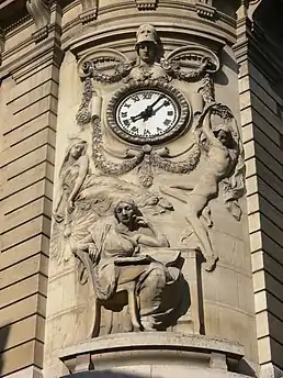 En effet, Pascal est l'architecte qui achève de donner au site Richelieu sa forme de quadrilatère, en complétant l'angle nord-est de l’ilot, auparavant occupé par des maisons particulières[30]. Il est le concepteur de la salle ovale, pensée pour être la grande salle de lecture publique de la Bibliothèque nationale, et des corps de bâtiments qui l’entourent, destinés notamment au Cabinet des Médailles. Les travaux de l'aile donnant sur la rue Colbert débutent en 1898 et ceux côté rue Vivienne ont lieu entre 1902 et 1906[29]. Cherchant la cohérence avec les collections présentées par le Cabinet des Médailles, Pascal s'inspire de l'Antiquité : il aménage un second arc triomphal à la romaine en haut de l'escalier d'honneur qu'il a entièrement refait et une salle dotée de colonnes dans la nouvelle aile sur jardin. Il fait décorer la salle suivante, dite du Grand Camée, par des motifs de médailles aux angles du plafond, et surtout il conçoit une salle aux bonnes dimensions dans l'aile Vivienne pour recevoir les décors du salon Louis XV provenant de l'ancien hôtel de Nevers[32]. Côté extérieur, il fait orner la façade sur jardin de médailles représentant François Ier, Henri IV, Richelieu, Louis XV et Napoléon Ier, ces profils représentant des moments symboliques dans l'histoire de la bibliothèque. La façade côté rue Vivienne est ornée de personnalités symbolisant l'art des grandes période : Denys de Syracuse pour l'art grec, Galba pour l'art romain, Lionel d'Este pour la Renaissance, Louis XIV pour le classicisme français, et une figure de la République française pour le XIXe siècle[29]. Seuls deux décors échappent à ce rappel des collections sur les façades : la porte de Bronze, ornée d'un coq sur le heurtoir, prévue originellement pour accéder à la salle ovale depuis la rue Vivienne ; et le haut-relief entourant l'horloge placée à l'angle des rues Vivienne et Colbert en 1903. Cette sculpture de Louis-Ernest Barrias représente l'Étude à sa table de travail entre la veille et le sommeil. Elle est encadrée au-dessous par un coq gaulois, et au niveau de la toiture d'une chouette d'Athéna[29].