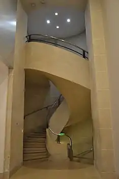 La salle ovale n'est inaugurée qu'en 1936, alors que Recoura n'est déjà plus architecte de la bibliothèque : la charge a été reprise par Michel Roux-Spitz dès 1932[33]. Ce dernier n'apporte pas de modifications significatives extérieures aux bâtiments. En revanche il modernise radicalement les espaces intérieurs[34]. Il réaménage notamment l'hôtel Tubeuf, entre 1938 et 1946 pour le département des Estampes, et entre 1942 et 1954 pour le département des Cartes et Plan[34]. Michel Roux-Spitz commence également la surélévation du magasin central, qui sera achevée par son successeur André Chatelin en 1959[33].