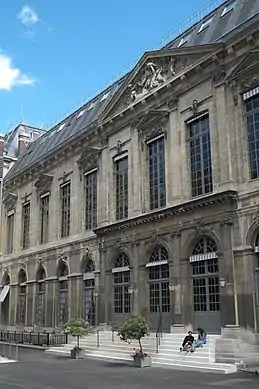 À la mort de Labrouste en 1875, Jean-Louis Pascal lui succède. Bien que s'inspirant des projets de son prédécesseur, il respecte beaucoup l'historicité des lieux et essaye de concilier modernisme et témoins du passé. Il reconstruit à partir de 1878 la façade nord de la cour d'honneur de Jacques V Gabriel, puis restaure la façade est de Robert de Cotte[29]. De 1878 à 1886 il rénove et modernise l'aile de Cotte : il réalise notamment la salle de lecture des Manuscrits, d'inspiration XVIIIe siècle, où il insère d'anciennes boiseries Louis XV provenant de l'ancien hôtel de Nevers[29]. Sous le nouveau porche d'entrée du 58 rue de Richelieu, il fait placer quatre statues représentant l'Imprimerie par Labatut, la Gravure par Hugues, la Calligraphie par Coutan et la Numismatique par Becquet. Pascal se distingue par sa démarche muséographique : il souhaite mettre en valeur les œuvres de la bibliothèque. Il conçoit un projet de couverture de la cour d'honneur, rappelant le projet d'Étienne-Louis Boullée, mais pour en faire une vaste halle d'exposition et non une salle de lecture, avec un toit de verre et de métal[48]. Ce projet faisant quelque peu polémique, il est abandonné[32]. Jean-Louis Pascal pourra cependant faire œuvre de muséographe dans le nouveau bâtiment en construction sur la rue Vivienne.