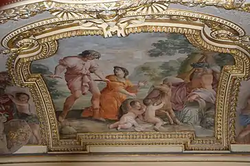 La galerie haute, dite galerie Mazarine, a elle conservé intégralement son plafond peint par Giovanni Francesco Romanelli. À l'origine percée de trois coupoles, le plafond de la galerie est modifié à la demande de Mazarin afin que Romanelli puisse concevoir un vaste cycle de fresques. Au centre, Jupiter foudroie les Géants, entouré de quatre grands compartiments représentant Apollon sur le Parnasse et l’histoire d’Hélène avec le Jugement de Pâris, l’Enlèvement d’Hélène et l’Incendie de Troie. Vingt-deux petites scènes complètent l’ensemble, accompagnées de figures au naturel et de faux stucs peints par Gismondi[41]. Cette réalisation a traversé les siècles, échappant aux aléas de l'Histoire.
