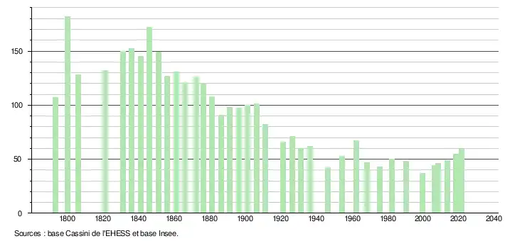 | L'évolution du nombre d'habitants est connue à travers les recensements de la population effectués dans la commune depuis 1793. Pour les communes de moins de 10 000 habitants, une enquête de recensement portant sur toute la population est réalisée tous les cinq ans, les populations légales des années intermédiaires étant quant à elles estimées par interpolation ou extrapolation[30]. Pour la commune, le premier recensement exhaustif entrant dans le cadre du nouveau dispositif a été réalisé en 2008[31]. En 2021, la commune comptait 59 habitants[Note 5], en augmentation de 15,69 % par rapport à 2015 (Haute-Garonne : +7,43 %, France hors Mayotte : +1,84 %). |