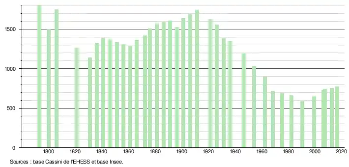 L'évolution du nombre d'habitants est connue à travers les recensements de la population effectués dans la commune depuis 1793. Pour les communes de moins de 10 000 habitants, une enquête de recensement portant sur toute la population est réalisée tous les cinq ans, les populations légales des années intermédiaires étant quant à elles estimées par interpolation ou extrapolation[6]. Pour la commune, le premier recensement exhaustif entrant dans le cadre du nouveau dispositif a été réalisé en 2007[7].