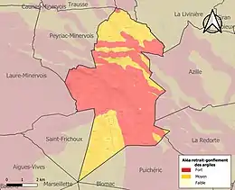 Le retrait-gonflement des sols argileux est susceptible d'engendrer des dommages importants aux bâtiments en cas d’alternance de périodes de sécheresse et de pluie. La totalité de la commune est en aléa moyen ou fort (75,2 % au niveau départemental et 48,5 % au niveau national). Sur les 1 083 bâtiments dénombrés sur la commune en 2019, 1083 sont en aléa moyen ou fort, soit 100 %, à comparer aux 94 % au niveau départemental et 54 % au niveau national. Une cartographie de l'exposition du territoire national au retrait gonflement des sols argileux est disponible sur le site du BRGM[25],[Carte 3].