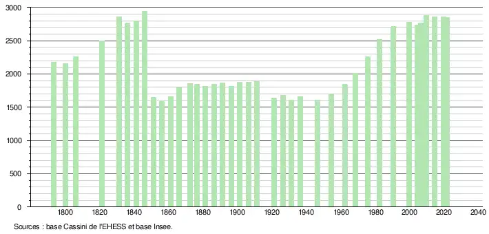 L'évolution du nombre d'habitants est connue à travers les recensements de la population effectués dans la commune depuis 1793. Pour les communes de moins de 10 000 habitants, une enquête de recensement portant sur toute la population est réalisée tous les cinq ans, les populations légales des années intermédiaires étant quant à elles estimées par interpolation ou extrapolation[29]. Pour la commune, le premier recensement exhaustif entrant dans le cadre du nouveau dispositif a été réalisé en 2004[30].