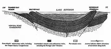 Parmi les formations rocheuses créées par le rift, on trouve des roches plutoniques (gabbro et granite) ainsi que des laves basaltiques[4]. Dans la région du lac Supérieur, les remontées de ces roches fondues peuvent être dues à un point chaud, qui a produit une jonction triple[2]. La région s'est soulevée, et des flots de lave basaltique se sont écoulés à partir de l'axe central du rift, de façon analogue à la formation actuelle de la dépression de l'Afar.