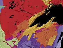 Le rift médio-continental (Midcontinent Rift System, MRS), rift nord-américain, ou rift de Keweenaw[alpha 1] est un rift de 2 000 km de long, situé au centre du continent nord-américain et au milieu du bord sud de la plaque nord-américaine. Il s'est formé lorsque le cœur du continent, le craton nord-américain, a commencé à se désagréger durant le Mésoprotérozoïque, il y a 1,1 milliard d'années. La formation du rift fut avortée (il s'agit d'un aulacogène), laissant des couches épaisses de roches magmatiques exposées au nord, mais recouvertes par des formations sédimentaires ultérieures sur la plus grande partie des bras est et ouest, lesquels se rejoignent au lac Supérieur, qui est entièrement contenu dans la vallée du rift. La rive nord (en), située en Ontario et dans le Minnesota, définit l'arc nord du rift. Partant du lac, le bras est du rift tourne vers le sud du Michigan, et s'étend peut-être jusqu'à travers l'Indiana, l'Ohio, le Kentucky, le Tennessee et l'Alabama[1]. Le bras ouest traverse une partie du Wisconsin, du Minnesota, de l'Iowa, et du Nebraska pour atteindre le nord-est du Kansas[2], et peut-être même l'Oklahoma[3].