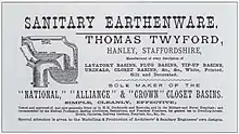 Thomas William Twyford, qui a inventé la toilette monobloc en céramique, est un autre fabricant[45]. Les années 1870 se sont avérées être une période déterminante pour l'industrie sanitaire et les toilettes. Le débat qui départage la simple cuvette à siphon entièrement en terre cuite du le cabinet d'eau mécanique très complexe, compliqué et coûteux alimente sous la curiosité du public et des avis d'experts. En 1875, la Toilette à retenue d'eau (wash-out trap water closet) est vendue pour la première fois et conquiert la préférence du public pour les toilettes à cuvette. En 1879, Twyford avait conçu son propre type wash out trap water closet, il l'a intitulé National et il est devenu le cabinet de toilette le plus populaire.