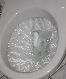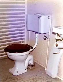 Les toilettes à retenue d'eau (washout toilet, ou flachspüler) consistent en une cuvette dans laquelle les matières tombent sur une nappe d'eau maintenue en permanence dans une dépression, à faible distance de la lunette. Ce modèle de cuvette est employé dans les établissements sanitaires, lorsqu'il y a utilité à procéder à l'examen des selles[16]. Les cuvettes sont rincées par un jet d’eau qui entraîne les excréments dans le siphon ci-dessous. À partir de là, le flux d'eau l'évacue dans le système d'égout. Un avantage de cette conception est que les utilisateurs ne sont pas éclaboussés par le bas. Les toilettes à retenue d'eau comportent un bassin d'eau peu profond dans lequel sont déposés les déjections, avec un siphon juste derrière ce bassin. Les déchets sont éliminés de ce bassin, emportés par le siphon (généralement un siphon en P ou un siphon en S) puis dans un égout, par l’eau provenant de la chasse. Les toilettes à retenue d'eau ont été parmi les premiers types de toilettes en céramique inventées et depuis le début des années 70, on ne les trouve plus que dans un nombre décroissant de localités en Europe continentale[réf. nécessaire]. Les toilettes à retenue d'eau étaient autrefois principalement utilisée en Allemagne, en Autriche et en France. Elles ont été brevetées en Grande-Bretagne par George Jennings en 1852 et sont restées le type de toilette standard en Grande-Bretagne tout au long du XIXe siècle[17]. On peut trouver des exemples de ce type de toilettes en Australie, en Autriche, en République tchèque, en Allemagne, en Hongrie, aux Pays-Bas et dans certaines régions de Pologne, bien qu'elles deviennent moins courantes.