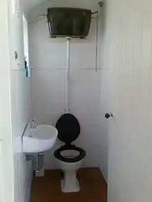 Une toilette à chasse d'eau ou WC (en anglais flushing toilet, flush lavatory, water closet, WC, ou commode en anglais familier américain) est une toilette qui élimine les excréments humains (en) (urine et matière fécale), utilisant comme véhicule l'eau, qui les fait passer à travers le tuyau de chute, vers un autre endroit pour l'élimination, maintenant ainsi une séparation entre les humains et leurs excréments. Les toilettes à chasse d'eau peuvent être conçues pour s'asseoir (dans ce cas, elles sont également appelées "toilettes occidentales") ou pour s'accroupir, dans le cas des toilettes à la turque (en anglais squat toilets). À l'opposé de la solution apportée par la chasse d'eau, il y a les toilettes sèches qui n'utilisent pas d'eau pour la chasse.