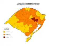 Le Rio Grande do Sul (prononcé en portugais brésilien : [ˈʁi.u ˈɡɾɐ̃dʒ(i) du ˈsuw]) est le plus méridional des 27 États du Brésil. Il est séparé de l'État de Santa Catarina par le rio Mampituba, est bordé à l'est par l'océan Atlantique et est frontalier avec l'Argentine et l'Uruguay. Sa capitale est Porto Alegre (1 409 939 habitants, en 2010)[1]. En 2019, l'État, qui compte 5,4 % de la population brésilienne, est responsable de 6,6 % du PIB du pays[2],[3],[4],[5].