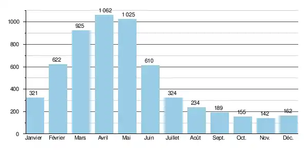 Sur la durée d'observation de 14 ans, le débit minimum observé a été de 63 m3/s en septembre-octobre, tandis que le débit maximal se montait à 1 880 m3/s (en mai).